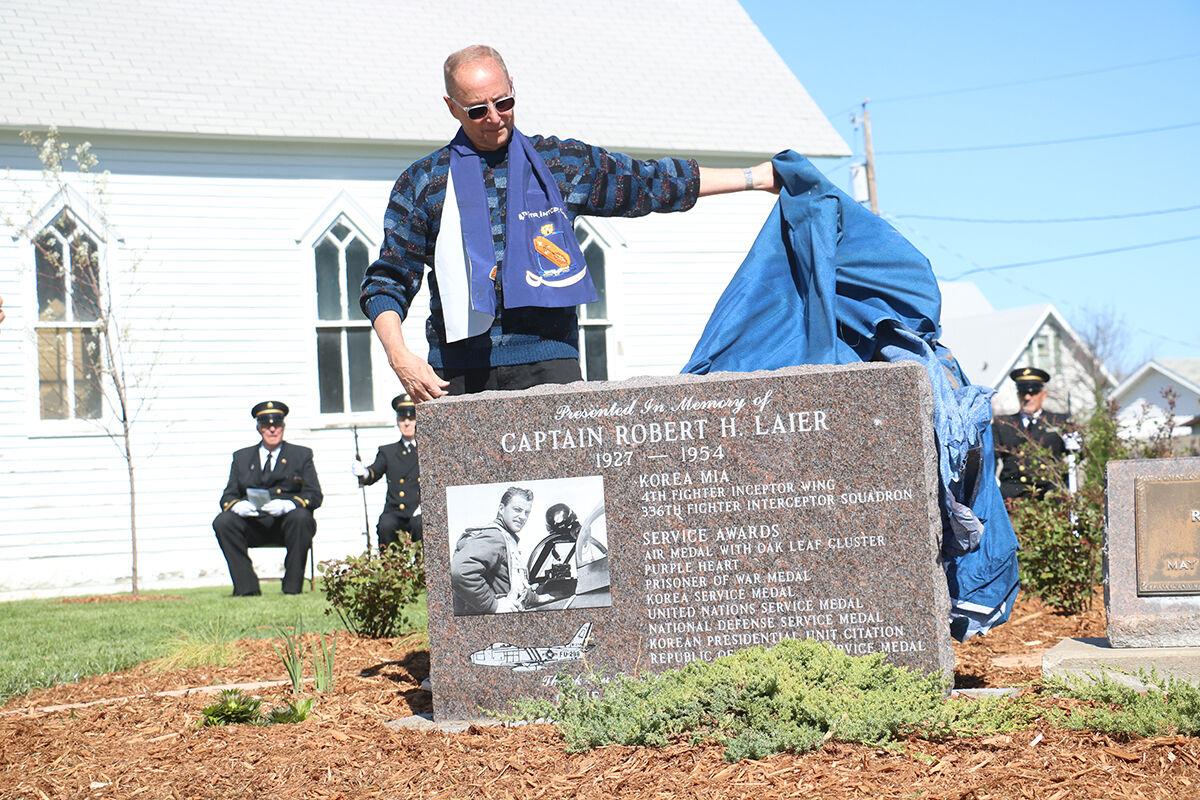 Capt. Robert Laier - photo from his son Richard. . Richard Laier unveils the new monument to his father, Robert Laier, during the ceremony held on Tuesday. / C-H photo • Brian Neben Full article/source: https://lexch.com/news/cozad-honors-native-son-robert-laier-who-was-shot-down-and-killed-during-the-korean/article_1a782986-af3a-11eb-8fc2-d3c1e8e9d589.html A picture of Richard wearing his fathers scarf in front of the memorial. An incredible photo. Thanks for sharing!